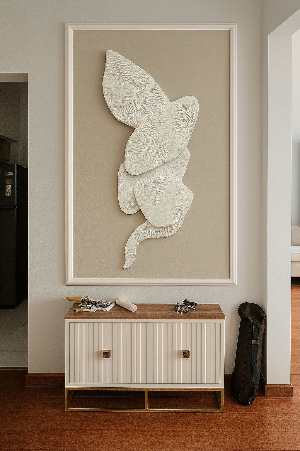 “Conexiones” es una obra mural texturada hecha a mano.